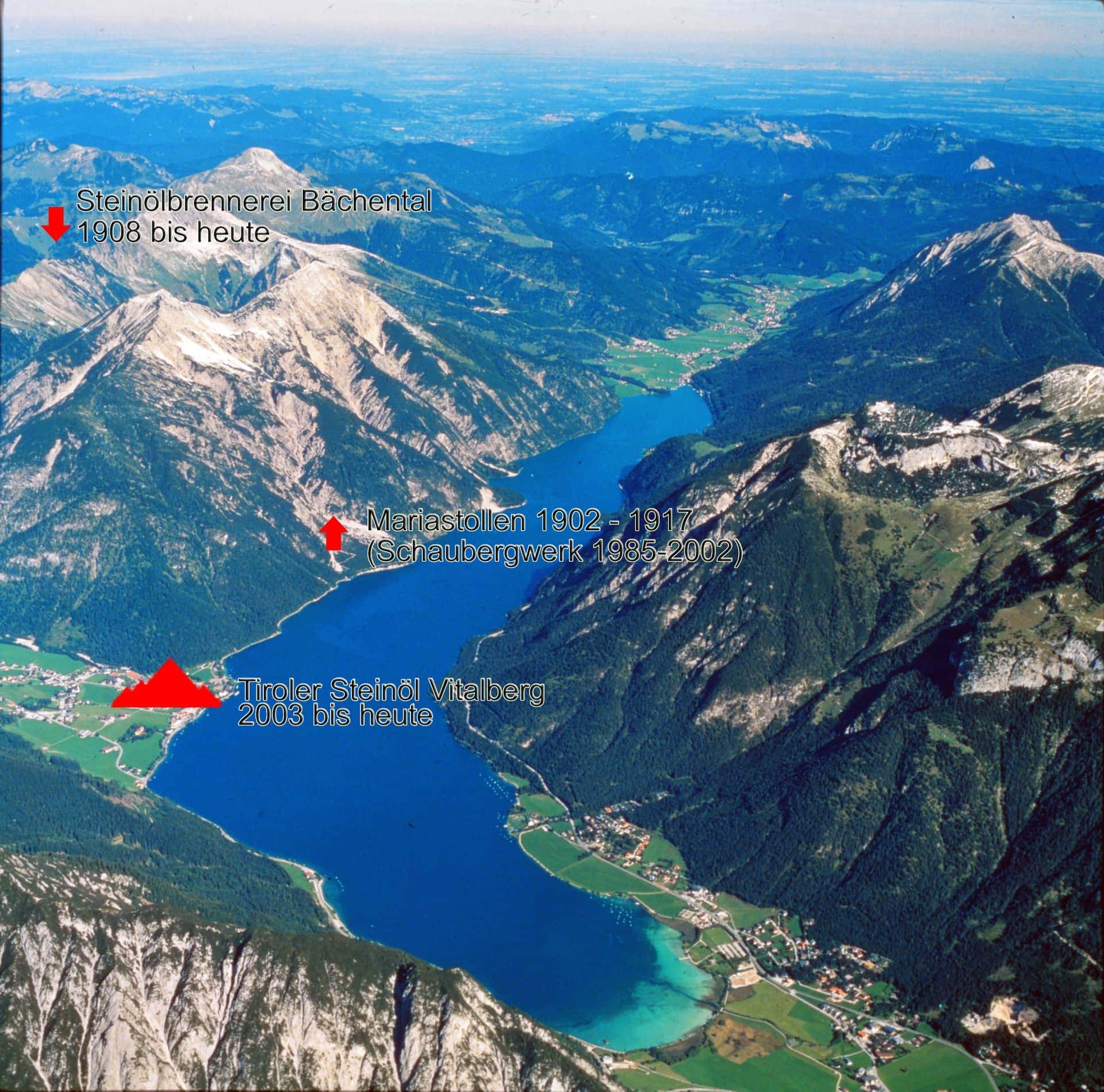 An dieser Stelle zerstörte 1917 eine gewaltige Staublawine die erste Anlage zur Steinölgewinnung von Martin Albrecht Senior am Achensee (siehe Beitrag „Die Lahn kimmt!“). Mehr als 65 Jahre lang lagen die „Überreste“ des Bergwerks brach und waren der Witterung und der Umwelt ausgesetzt. Mit der Entdeckung des großen Ölschiefervorkommens im Bächental im Jahre 1908 gab es für die Familie Albrecht keinen Grund mehr, die ohnehin spärlichen Vorkommen am Seeberg weiter mühsam abzubauen oder diese Anlage neu zu errichten.